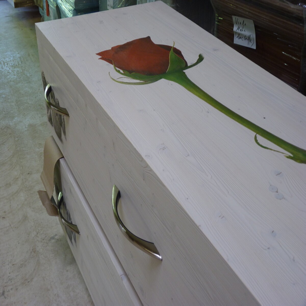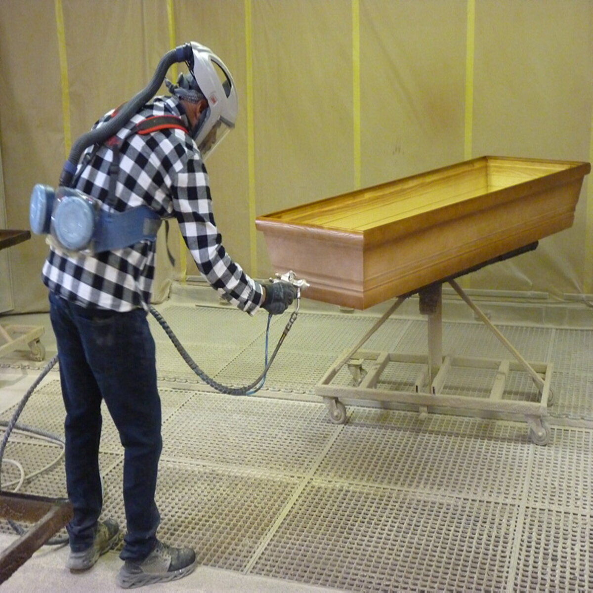 Dass es die braucht bei gut 20.000 ausgelieferten Särgen im vergangenen Jahr ist leicht nachvollziehbar. Immerhin wollen rund 700 Bestatterkunden in Deutschland und rund zehn in Luxemburg zeitnah mit Qualitätsware beliefert werden. Und diese Kunden haben die Wahl – können grundsätzlich aus drei verschiedenen Produktlinien wählen. Die Premiumprodukte aus eigener Herstellung werden unter dem Nachhaltigkeits-Label „Made im Hunsrück“ beworben, dann gibt es zugekaufte Rohsärge, die bei Andres & Massmann nach Kundenwunsch veredelt werden und als dritte Angebotspalette „normale Handelsware“, wie Dirk Kämmerling dieses zusätzliche Handelsstandbein seines Unternehmens bezeichnet. Will damit sagen, die Sargfabrik ist auch ein großer Großhändler, der immer rund 2.000 Särge auf Lager hat, „einfach, um auch mal Kunden schnell und unkompliziert beliefern zu können“, erklärt der 60-Jährige die großzügige Lagerhaltung.