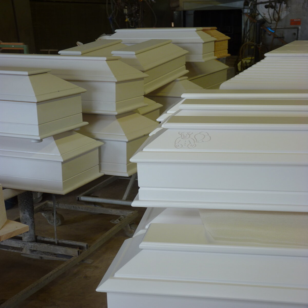 Apropos großzügig. So eine Sargfabrik darf man sich als Giganto-Schreinerei mit Maschinenhalle, Holzlager, Lackier- und Montagehalle und natürlich dem riesigen Teile- und Endproduktlager vorstellen. Sargherstellung auf einem Gelände von 55.000 Quadratmetern im Gewerbegebiet von Blankenrath, die Hallen schon von Weitem sichtbar, ob ihrer schieren Größe und Ausdehnung.