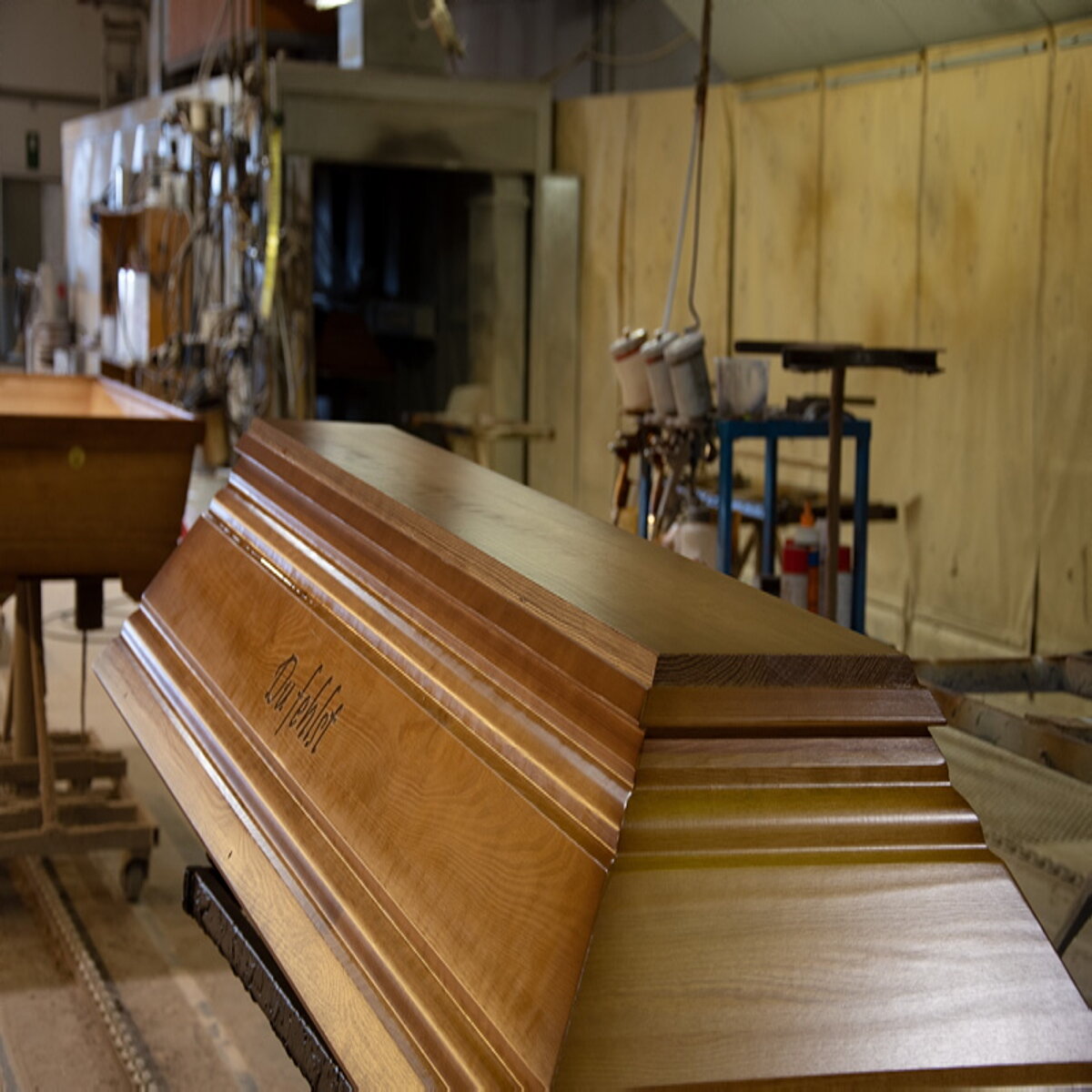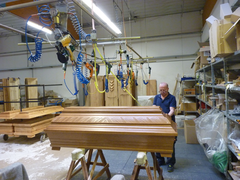 Apropos großzügig. So eine Sargfabrik darf man sich als Giganto-Schreinerei mit Maschinenhalle, Holzlager, Lackier- und Montagehalle und natürlich dem riesigen Teile- und Endproduktlager vorstellen. Sargherstellung auf einem Gelände von 55.000 Quadratmetern im Gewerbegebiet von Blankenrath, die Hallen schon von Weitem sichtbar, ob ihrer schieren Größe und Ausdehnung.