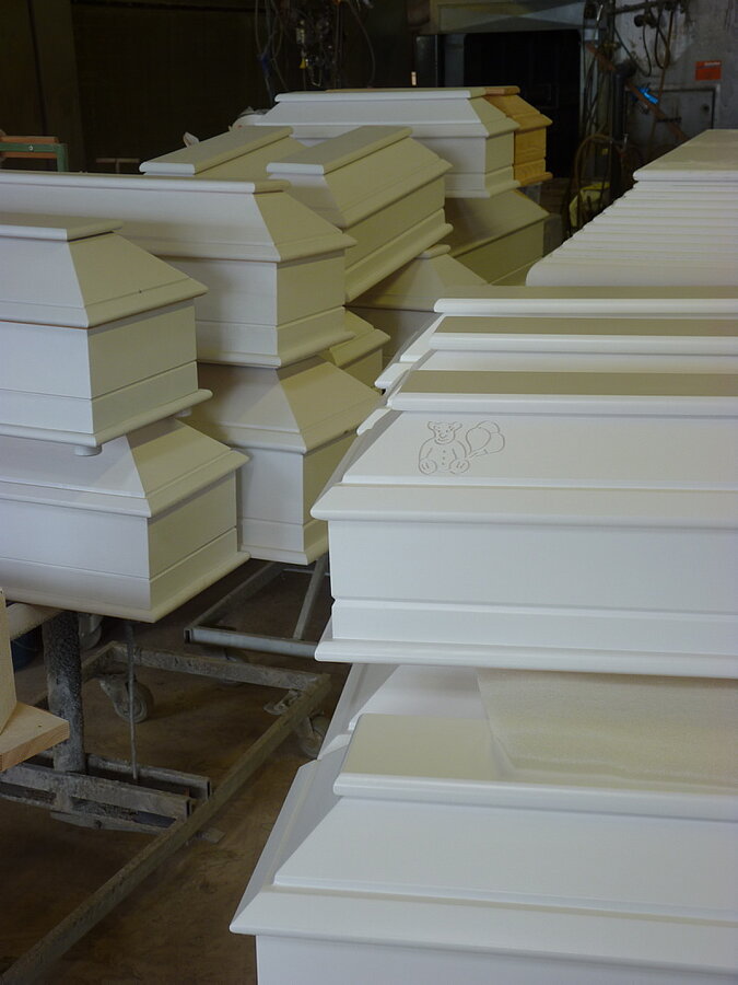 Dass es die braucht bei gut 20.000 ausgelieferten Särgen im vergangenen Jahr ist leicht nachvollziehbar. Immerhin wollen rund 700 Bestatterkunden in Deutschland und rund zehn in Luxemburg zeitnah mit Qualitätsware beliefert werden. Und diese Kunden haben die Wahl – können grundsätzlich aus drei verschiedenen Produktlinien wählen. Die Premiumprodukte aus eigener Herstellung werden unter dem Nachhaltigkeits-Label „Made im Hunsrück“ beworben, dann gibt es zugekaufte Rohsärge, die bei Andres & Massmann nach Kundenwunsch veredelt werden und als dritte Angebotspalette „normale Handelsware“, wie Dirk Kämmerling dieses zusätzliche Handelsstandbein seines Unternehmens bezeichnet. Will damit sagen, die Sargfabrik ist auch ein großer Großhändler, der immer rund 2.000 Särge auf Lager hat, „einfach, um auch mal Kunden schnell und unkompliziert beliefern zu können“, erklärt der 60-Jährige die großzügige Lagerhaltung.